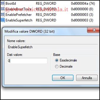 | 1. Apriamo il Menu Start e clicchiamo su Esegui, oppure utilizziamo la combinazione di tasti Windows + R e nella casella Esegui digitiamo regedit seguito da Invio. Navighiamo alla chiave: HKEY_LOCAL_MACHINE\SYSTEM\CurrentControlSet\Control\Session Manager\MemoryManagement\PrefetchParameters 2. A questo punto con un doppio clic apriamo la chiave EnableSuperFetch e modifichiamo i Dati Valore a 0. Confermiamo le modifiche cliccando OK e riavviamo il sistema. | ||