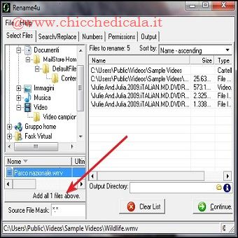 | 3. Selezionate i file che volete rinominare e spostateli nella colonna di destra. Potete scegliere anche documenti non contigui (basta tener premuto il tasto CTRL). Se volete rinominare tutti i file elencati, basta premere il pulsante che si trova nella parte inferiore (Add all files above). 4. Se vi accorgete di aver aggiunto dei file per sbaglio, oppure volete rifare tutto daccapo, esiste sempre la possibilità di svuotare l’elenco dei file da rinominare. Basta fare clic sul pulsante “Clear list”. Vi verrà chiesto se siete sicuri di procedere. | ||