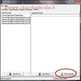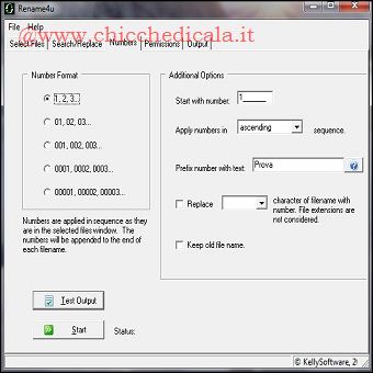 | 7. A questo punto spostatevi nella scheda Numbers. Qui occorre stabilire i parametri che verranno utilizzati per rinominare i file. Visto che abbiamo deciso di chiamare i file “Prova” e di differenziarli uno dall’altro con dei numeri, procedete come segue. Nella sezione “Number format” scegliete i valori a tre cifre (se i vostri file sono più di 99). In “Apply numbers in” scegliete “Ascending”, in modo da andare dal più piccolo al più grande. Infine in “Prefix number with text” mettete la parola “che preferite”. Fate clic su “Test output” per avere un’anteprima del risultato. 8. Ora potete procedere a rinominare tutti i file. Non vi resta altro da fare che premere il pulsante “Start rename now”. Et voilà: tutti i file sono stati ribattezzati! | ||