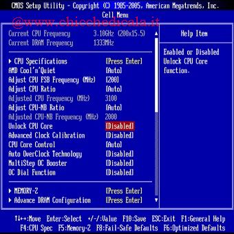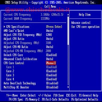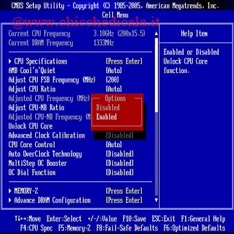 | Accedere al BIOS ed entrare nell’elenco delle opzioni Cell Menu. Cambiare l’opzione “Unlock CPU Core” a “Enabled“, stessa cosa per “Advanced Clock Calibration“. Ora sarà presente la possibilità di abilitare / disabilitare i 4 Core. | ||