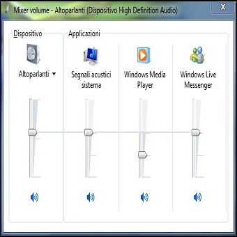 | Il mixer audio non è uno strumento utilizzato di frequente in Windows, in quanto generalmente usiamo solo la barra del volume. Tuttavia, in Windows 7 è più utile che mai, perché consente, per ogni applicazione in esecuzione, di definire il livello del suono che preferiamo. Così, ad esempio, possiamo definire differenti settaggi di volume per Messanger, di Windows Media Player, dei segnali acustici di sistema e cosi via. | ||
