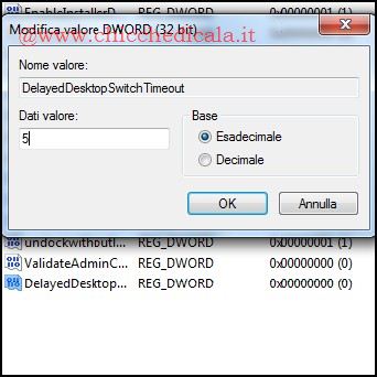 | 1. Apriamo il Menu Start e clicchiamo su Esegui, oppure utilizziamo la combinazione di tasti Windows + R e nella casella Esegui digitiamo regedit seguito da Invio. Navighiamo alla chiave: HKEY_LOCAL_MACHINE \ SOFTWARE \ Microsoft \ Windows \ CurrentVersion \ Policies \ System 2. Nel riquadro di destra, creare un nuovo valore DWORD DelayedDesktopSwitchTimeout e impostare il suo valore a 5. Riavviare il sistema per rendere le modifiche operative. NOTA: Per facilitare l’operazione la redazione a preparato la chiave di registro da unire. Basterà scaricare l’archivio, scompattarlo sul desktop e unire la chiave al registro di sistema. NOTA: È anche possibile richiedere a Microsoft l’hotfix per risolvere questo problema. NOTA: Questo bug è presente anche in Windows Vista e Server 2008, quindi se si deve affrontare tale problema, è possibile seguire la stessa procedura descritta in questo tutorial. | ||