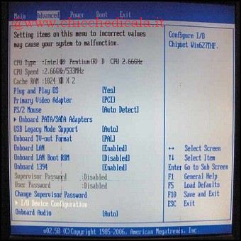 | 7. Dopo aver premuto il pulsante di accensione del computer, dovete entrare nella schermata del BIOS, ovvero il “pannello di controllo” dell’hardware del computer. In base al produttore della scheda madre, il pulsante da utilizzare è differente: i più comuni sono CANC, F1, F2 o più raramente una combinazione di tasti: per esempio ALT+F2. Nella schermata principale (Main) ci sono delle voci di menu nella parte alta, proprio come una finestra di Windows. Non toccate le impostazioni qui presenti: rischiate il malfunzionamento dell’intero sistema. Cercate solo il menu che vi interessa, ovvero quello relativo alle periferiche integrate. 8. A seconda del modello di scheda madre, il nome in inglese da cercare è “Onboard Device Configuration”, oppure “I/O Device Configuration”. Premete INVIO per entrare nel menu e cercate la voce relativa alla scheda audio, denominata “Onboard Audio” o “Audio Device”. | ||