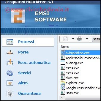 | 1. Per avviare l’installazione del software, scompattiamo l’archivio a2HiJackFree.zip in una cartella dell’hard disk e poi eseguiamo il file a2HijackFreeSetup.exe. Basta seguire i passi della procedura guidata e cliccare su finish per avviarlo. | 2. Diversi programmi vengono eseguiti in automatico all’avvio di Windows. Per controllare che siano tutti leciti, dal menu a sinistra dell’interfaccia clicchiamo su Esec. automatica: verrà visualizzato l’elenco dei processi attivi nel sistema operativo. | |