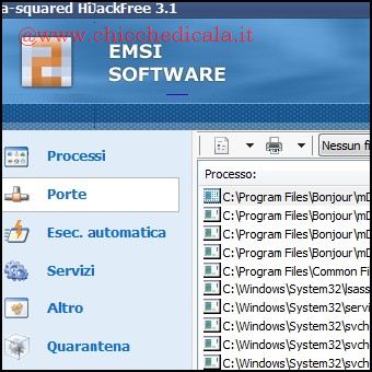 | 3. Per essere certi che non vi siano eventuali intrusi, analizziamo in dettaglio tutti i software in esecuzione. Cicchiamo dunque sul link Processi e dal riquadro in alto selezioniamo il programma sospetto per visualizzarne le caratteristiche e le librerie. | 4. Come risaputo, trojan, worm e spyware per trasmettere o ricevere informazioni agli Hacker informatici necessitano di un accesso a Internet. Per scovare questi ospiti indesiderati, cicchiamo su Porte e analizziamo i software che dialogano con l’esterno. | |