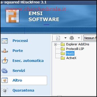 | 5. Verifichiamo che nessun software dannoso abbia modificato il file hosts usato da Windows per gestire le connessioni. Cicchiamo su Altro/Hosts. se compare solo la voce 127.0.0.1 localhost è tutto OK, altrimenti cancelliamo quelle sospette. | 6. Nella sezione Quarantena vengono elencati eventuali programmi o file potenzialmente dannosi. Se siamo certi della loro pericolosità, clicchiamo su Cancella per eliminarli definitivamente. Altrimenti possiamo riattivarli premendo Ripristina. | |