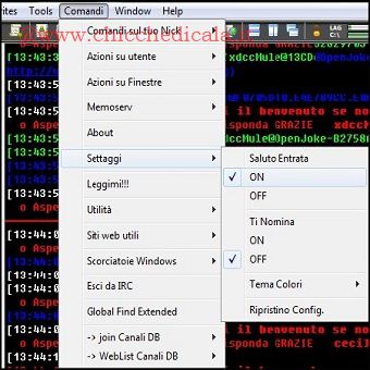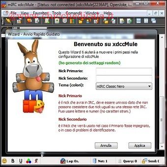 | 1. L’installazione di xdccmule è davvero semplice e con pochi passi il programma è operativo sul nostro sistema. Facendo doppio clic sull’icona creata sul desktop si aprirà, solamente la prima volta, una finestra che ci invita a verificare i nick generati automaticamente. È buona norma modificare il suffisso “xdccmule” per evitare di essere allontanato dai canali. 2. Il buon funzionamento delle chat è dipendete dalla netiquette, ovvero la forme di rispetto tra utenti. È sempre bene quindi essere educati e salutare quando si entra in un canale. Per non scordarci di queste regole basilari possiamo automatizzare la procedura impostando il \t\tSaluto Entrata dal menu Comandi /Settaggi /Saluto Entrata ON. | ||