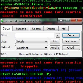| 3. Per effettuare una ricerca è sufficiente cliccare sul pulsante Global Find posizionato in alto a sinistra o raggiungibile dal menu Comandi /Global Find Extended. Nel campo nome inseriamo il temine da ricercare, la lista deve essere selezionata su Generale mentre il network su GlobalNet e clicchiamo su Cerca. 4. Dopo qualche secondo di attesa cominceranno ad apparire, lista per lista, i risultati trovati con il numero di Decorrenze riscontrate. Per avere informazioni più dettagliate sui file presenti nelle varie liste è sufficiente fare doppio clic sulla riga interessata e, scelto il file giusto, con un altro clic del mouse si avvierà il download. | ||