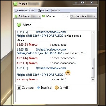 | 5-6. Ecco la nostra lista contatti, un doppio clic per iniziare la conversazione con i nostri amici. A differenza di MessengerDiscovery, con Pidgin avremo la possibilità di poligamia. Cosa significa ? che possiamo chattare da entrambe le parti, sia su Facebook che con Pidgin. | ||