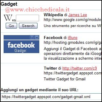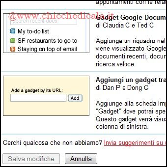 | 1. Entriamo nel nostro account Gmail e portiamoci in Impostazioni/ Labs. Scorriamo la pagina e spuntiamo Attiva su Aggiungi un Gadget tramite URL. A questo punto clicchiamo sul pulsante Salva Modifiche per confermare. 2. Rimanendo in Impostazioni spostiamoci nella sezione Gadget, incolliamo le seguenti URL integrandole con il pulsante Aggiungi: FACEBOOK: http://hosting.gmodules.com/ig/gadgets/file/104971404861070329537/facebook.xml | ||