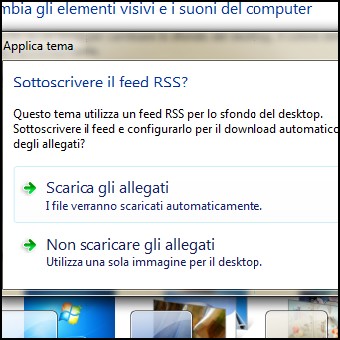 | 3. Ora si dovrebbe vedere l’icona del tema sul desktop. Lanciandola con un doppio clic, visualizzeremo una finestra di conferma, che ci chiederà se vogliamo iscriverci al feed RSS. Accettiamo selezionando scaricare gli allegati. 4. Con un clic destro sul desktop accediamo al pannello personalizza, dove vedremo il tema che cambierà quotidianamente. Ricordiamo che sul web esistono anche feed RSS che cambiano ogni ora, a voi la scelta !! | ||