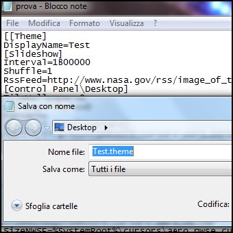 | 1. Ci sono alcuni programmi che lavorano per per questo scopo, ma in realtà un breve script farà la stessa cosa senza dover scaricare nulla. Apriamo un file di testo col Blocco note e incolliamo questo codice. Potete notare un paio di cose su questo codice. In primo luogo, nell’esempio preleviamo le immagini dal sito Nasa.gov. La seconda riga del codice, DisplayName=Test, corrisponde al nome che si desidera visualizzare nel pannello di personalizzazione del tema. È possibile modificare il nome o qualsiasi altra cosa, basta farlo subito dopo DisplayName= e non digitare lo spazio. L’altra cosa che potreste notare è la sesta riga: RssFeed=http://www.nasa.gov/rss/image_of_the_day.rss. È possibile utilizzare qualsiasi feed RSS sul web modificando questa linea con l’indirizzo del feed RSS che desiderate. Anche in questo caso, ricordatevi di non usare lo spazio dopo l’=. 2. Ora, clicchiamo su File/Salva con nome e digitiamo il nome Test.theme. Assicuriamoci di aver scelto l’opzione tutti i file. A questo punto è meglio salvare il tema sul desktop, è sempre possibile spostarlo in un secondo momento. | ||