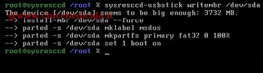 | 3. Eseguiamo “sysresccd-usbstick writembr /dev/sda” per creare sulla pendrive l’MBR per poter avviare SystemRescueCD. | ||