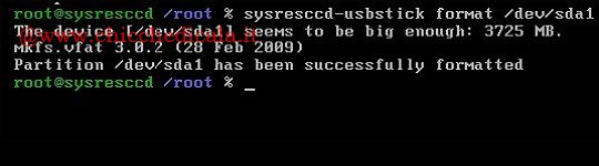 | 4. Inoltre, formattiamo la partizione in cui andremo a copiare la distribuzione eseguendo “sysresccd-usbstick format” seguito dal relativo file di dispositivo (nel nostro caso /dev/sda1). | ||