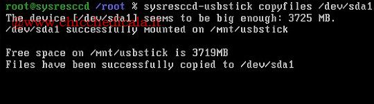 | 5. Non resta che copiare i file della distro sulla chiavetta con “sysresccd-usbstick copyfiles” seguito dal dispositivo della partizione. | ||