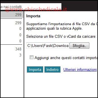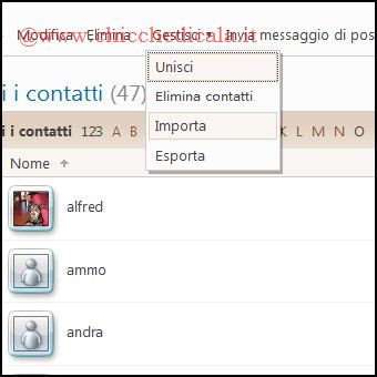 | 1. Una volta importati tutti i contatti in hotmail spostiamoci in Opzioni/Altre Opzioni e successivamente sul collegamento Contatti. Dalla barra in alto selezioniamo Gestisci/Esporta e digitiamo gli 8 caratteri per effettuare il download del file .cvs 2. Accediamo al nostro account GMail e dall’interfaccia principale selezioniamo la voce Contatti/Importa. Tramite il pulsante Sfoglia carichiamo il file scaricato precedentemente e clicchiamo sul pulsante Importa. | ||
