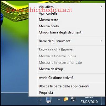 | 1. Creiamo una cartella vuota sul Desktop denominata Cestino. A questo punto, trasciniamo il Cestino di Windows sulla cartella per creare un collegamento al medesimo. Non ci resta che spostare la cartella in Raccolte\Documenti. 2. Clicchiamo col tasto destro sulla barra delle applicazioni e selezioniamo Sblocca La Barra Delle Applicazioni e, successivamente Barra Degli Strumenti/Nuova Barra Degli Strumenti. Scegliamo la cartella creata al passo precedente e clicchiamo Seleziona Cartella. | ||