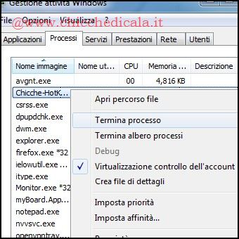 | 3. Dal momento che l’applicazione non dispone di un interfaccia grafica per chiuderla, basterà aprire la TaskManager, individuare il processo, cliccare col tasto destro del mouse e selezionare Termina Processo. Questo è il codice sorgente nel caso vogliate modificare alcuni valori a vostro piacimento: #è:: RegRead, HiddenFiles_Status, HKEY_CURRENT_USER, Software\Microsoft\Windows\CurrentVersion\Explorer\Advanced, HideFileExt If HiddenFiles_Status = 1 RegWrite, REG_DWORD, HKEY_CURRENT_USER, Software\Microsoft\Windows\CurrentVersion\Explorer\Advanced, HideFileExt, 0 Else RegWrite, REG_DWORD, HKEY_CURRENT_USER, Software\Microsoft\Windows\CurrentVersion\Explorer\Advanced, HideFileExt, 1 WinGetClass, eh_Class,A If (eh_Class = “#32770″ OR A_OSVersion = “WIN_VISTA”) send, {F5} Else PostMessage, 0×111, 28931,,, A Return | ||
