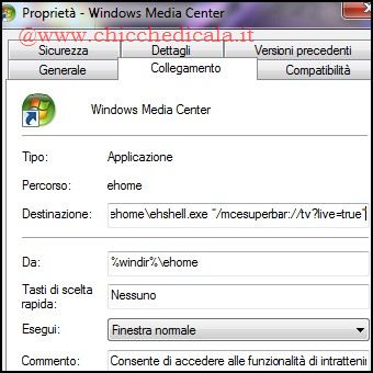 | 3. Nella casella destinazione si dovrebbe vedere il percorso %windir%\\ehome\\ehshell.exe. Lasciamo uno spazio dopo .exe e digitiamo “/mcesuperbar://tv?live=true”. Il risultato finale dovrà essere il seguente: %windir%\\ehome\\ehshell.exe “/mcesuperbar://tv?live=true” 4. Ecco fatto ! Ora Media Center sarà aperto direttamente in modalità Live TV sull’ultimo canale visualizzato. Se utilizzate WMC principalmente per guardare la TV in diretta, questo è un trucco che vi farà risparmiare alcuni clic. | ||