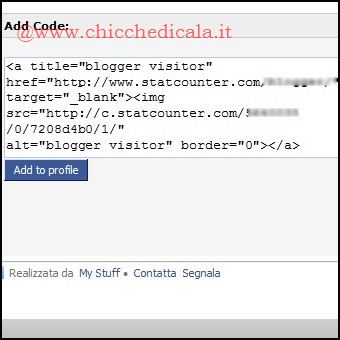 | 3. Finalmente abbiamo generato il codice HTML da incorporare nel nostro profilo Facebook. Ma come ? facile sfruttando un applicazione realizzata per altri scopi. 4. Portiamoci al seguente indirizzo, clicchiamo sul pulsante Consenti e nel Box “Add Code” incolliamo il codice HTML generato al passo successivo. Dopodichè clicchiamo “Add to profile“, nuovamente su “Aggiungi al profilo” e confermiamo con “Aggiungi“. | ||