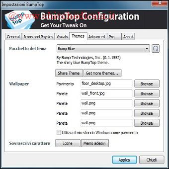 | 1. Per prima cosa, lanciate BumpTop e seguite la demo. Al termine apparirà una vista dall’alto. Per ottenere l’aspetto desiderato potete scegliere un tema nella selezione offerta dal programma. Fate clic sull’icona di BumpTop nell’area di notifica e selezionate Impostazioni / Temi. | 2. Qualsiasi icona o cartella sul vostro desktop BumpTop può essere ingrandita o rimpicciolita facendo clic destro su di essa e selezionando Aumenta o Diminuisci. Potete anche inclinare l’icona di un angolo a vostra scelta facendo clic sul bordo e trascinandolo. | |