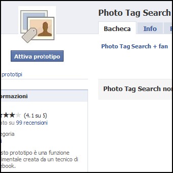 | 1. Facebook ha attivato il suo “laboratorio” di applicazioni in fase di test, disponibili agli utenti che desiderano provarle prima di un rilascio ufficiale. Fra queste c’è Photo Tag Search, sicuramente una delle più utili. Photo Tag Search ci consente di cercare tutte le immagini all’interno delle quali siamo stati taggati, noi o uno dei nostri amici. Per attivare l’applicazione è sufficiente collegarsi alla pagina di Photo Tag Search e cliccare sul pulsante in alto a sinistra “Attiva Prototipo”. 2. Una volta attivato, potremo recarci alla pagina generica delle immagini di Facebook; in questa pagina sarà apparso un nuovo box in alto a sinistra, all’interno del quale potremo inserire il nostro o il nome di uno (o più) dei nostri amici. Non dovremo fare altro che premere invio per trovare tutte le immagini che contengono il tag delle persone ricercate. | ||