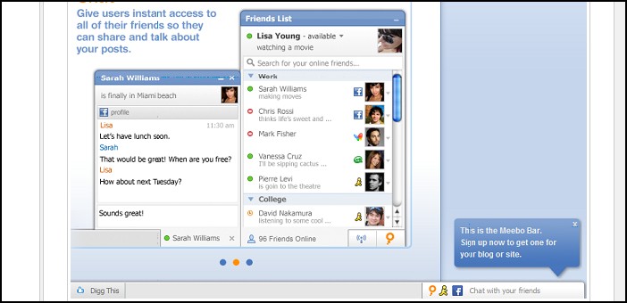 | Meebo è un instant Messanging on line che consente di collegarsi a più reti dal browser. Ebbene, la bella notizia consiste nella possibilità di integrare il sistema di chat direttamente sul proprio Sito. In sintesi è una barra, come quella degli strumenti, che si trova nella parte inferiore dello schermo e consente agli utenti di condividere storie, ricevere aggiornamenti in tempo reale, e chattare con gli altri, il tutto utilizzando il tuo sito. In questo modo aggiungengeremo un livello di interazione sociale che gli utenti potranno apprezzare. | ||