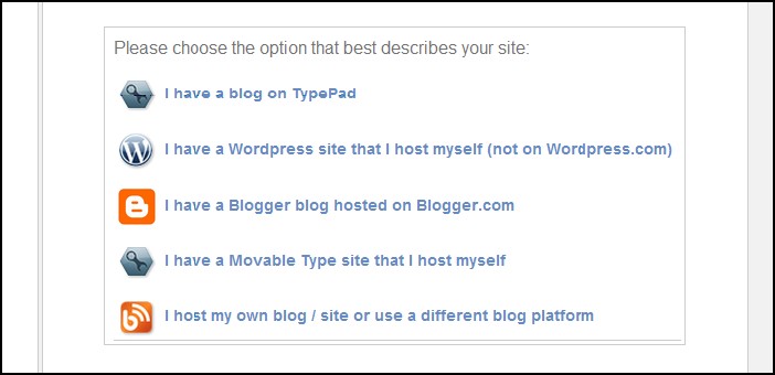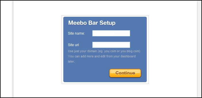 | Nella pagina successiva ci viene chiesto il nome del sito e l’URL. Compiliamo le informazioni e, ancora una volta clicchiamo su Continue. Ora dovremo essere alla Meebo Messenger Dashboard. Qui possiamo scegliere su quale piattaforma desideriamo installare la barra. Le scelte ricadono su piattaforme come TypePad, WordPress, Blogger, Movable Type, e altre. | ||