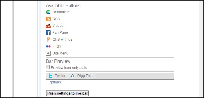 | È possibile aggiungere un pulsante Digg così la gente può votare il contenuto e un pulsante RSS in modo che possano iscriversi ai Feed. Utilizzare la Meebo chat così gli utenti potranno chattare con i loro amici dal tuo sito. È anche possibile creare pulsanti personalizzati dalla pagina Panoramica. Una volta configurata la barra nel modo desiderato, è possibile premere il tasto “Push settings to live bar” per aggiornarla con le nuove impostazioni. | ||