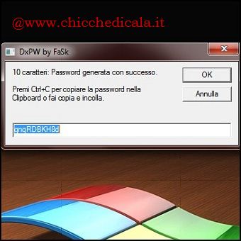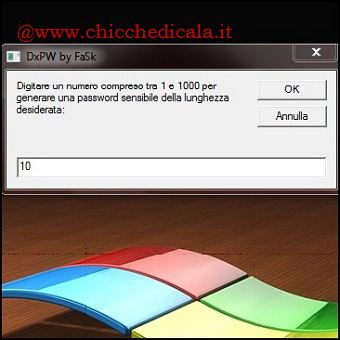 | 3. Per avere delle minime caratteristiche di sicurezza, una password deve essere piuttosto lunga e dovrebbe contenere non meno di 8 o 10 caratteri. La lunghezza ideale è dai 14 caratteri in su e deve contenere una serie di numeri e lettere maiuscole e minuscole. Questa scelta si rende necessaria per obbligare gli autori di un eventuale attacco brute-force a dover provare un grande numero di combinazioni. 4. Su questi principi DxPW è in grado di generare password sensibili e alfa-numeriche comprese da un numero di minimo 1 carattere a una massimo di 1000 caratteri. Una volta cliccato Genera Una Password, indichiamo la lunghezza desiderata e premiamo OK. Come potete vedere nella finestra successiva verrà generata la password richiesta. A questo punto basterà fare un copia e incolla oppure premere la combinazione di tasti Ctrl + C per copiarla nella Clipboard. NOTA: DxPW.vbs è compatibile con Windows XP/Vista/7. Le chiavi di registro sono compatibili con Windows Vista/7 | ||
