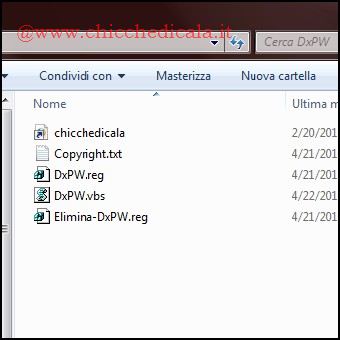 | 1. Scarichiamo l’archivio DxPW.zip e scompattiamo il contenuto sul desktop. All’interno della cartella troveremo due chiavi di registro e lo script .VBS. Spostiamo il File DxPW.vbs all’interno della directory Windows (C:\Windows). Nel caso avessimo abilitato il UAC rispondiamo Continua/SI per confermare l’operazione di spostamento. 2. Fatto ciò, con un doppio clic uniamo la chiave DxPW.reg al registro di sistema e, nelle due finestre successive rispondiamo SI/OK. Terminata l’operazione clicchiamo col tasto destro su un’area vuota del desktop per vedere comparire la voce Genera Una Password. | ||