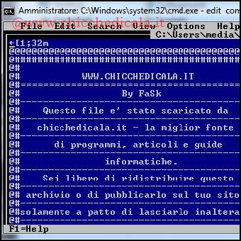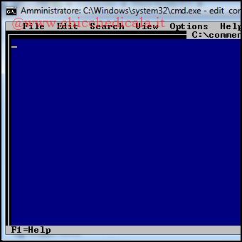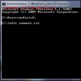 | 1. Il primo passo da compiere è quello di creare il file d testo che conterrà il nostro commento. Per chi possiede Windows Vista/7 andiamo su Start e nella casella di ricerca digitiamo cmd seguito da Invio, mentre per chi possiede il buon vecchio XP andiamo su Start, poi su Esegui e digitiamo cmd. Cicchiamo quindi sul pulsante OK per aprire il Prompt dei comandi DOS. Supponiamo di voler creare il nostro file sul disco rigido in C:\ e di chiamarlo Comment.txt. 2. All’interno della finestra DOS che abbiamo appena aperto, digitiamo cd\ e premiamo il tasto invio Nella riga successiva apparirà il prompt dei comandi C:\ seguito dal cursore. A questo punto digitiamo il comando edit Comment.txt e premiamo Invio. Se abbiamo eseguito nel modo corretto tutte le operazioni descritte nei passi precedenti, vedremo aprirsi la finestra dell’editor di testo di DOS. NOTA: MS-DOS Editor e’ un editor a schermo intero che consente di creare, modificare, memorizzare e stampare file di testo ASCII. Tuttavia va ricordato che, essendo l’editor un’applicazione a 16 bit, non è presente in alcuna versione di Windows a 64 bit. | ||