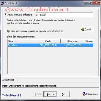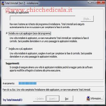 | 11. Lanciamo Total Uninstall e selezioniamo un nome per l’installazione, quindi selezioniamo cosa monitorare. Nella schermata indicata in figura selezioniamo Installa una o più applicazioni (Esce dal programma) e clicchiamo su \tEsci. 12. Eseguiamo il programma che vogliamo controllare e quando avremo finito lanciamo nuovamente Total Uninstall. Ci troviamo nella fase di analisi. Cliccando su Avanti potremo valutare le modifiche apportate al sistema da quel determinato programma, o da una serie delle nostre azioni. | ||