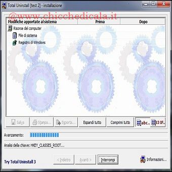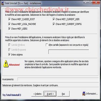E’ MEGLIO SAPEREDurante l’installazione di un programma (monitorata da Total Unistall), è buona norma non effettuare altra operazioni. Infatti, se lanciamo un altro programma o scriviamo un semplice file di testo, questo verrà interpretato come una modifica effettuata dall’installazione stessa. Quindi, se non vogliamo trovarci con decine dì voti inutili nel resoconto di un’installazione, è bene stare con le mani in mano. | ||