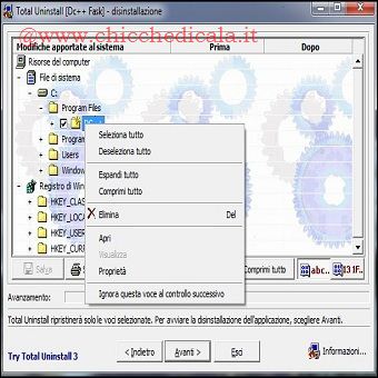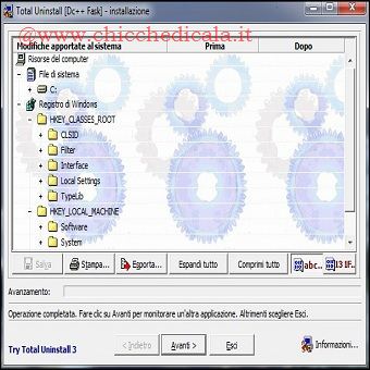 | 5. Al termine dell’installazione, torniamo a Totall Uninstall e clicchiamo su Avanti. Il programma comincerà l’analisi delle modifiche effettuate. Attendiamo il termine dell’analisi indicato dalla barra di avanzamento: i risultati verranno presentati in una struttura ad albero. I tasti Espandi/Comprimi Tutto permettono di aprire o chiudere la struttura visualizzata. 6. Dalla schermata di riepilogo, tramite gli appositi tasti sulla sinistra, è possibile salvare i risultati, stamparli, oppure esportarli in un file di testo. Esaminiamo le voci indicate e procediamo alla loro rimozione, qualora non fossero necessarie. A tal fine, selezioniamole con il mouse e dal menu a tendina del tasto destro scegliamo la voce Elimina. Infine, premiamo Avanti per concludere l’installazione. | ||