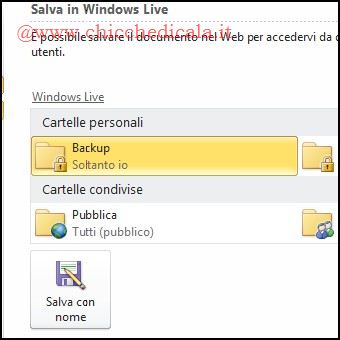 | 1. Il metodo che andremo ad analizzare è rivolto a tutti gli utenti che possiedono una copia di Office 2010 RTM. Dal menu Start/Tutti i Programmi/Microsoft Office, apriamo Word o Excel, selezioniamo il documento che vogliamo caricare o condividere e portiamoci nel menu File/Salva e Invia/Salva sul Web. 2. Clicchiamo il pulsante Connetti e inseriamo le credenziali del nostro account. Effettuato l’accesso evidenziamo la cartella di destinazione e clicchiamo Salva con Nome. | ||