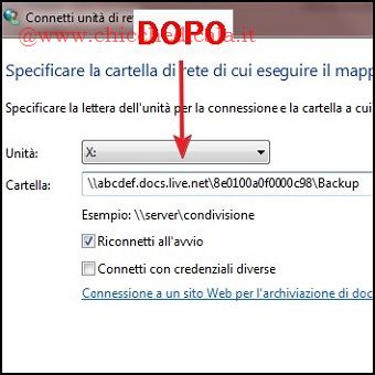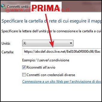 | 5. Per poter accedere alla cartella senza problemi il percorso necessità di una piccola modifica. Eliminiamo “https:” e sostituiamo tutti gli slash “/” col backslash “\\“. Assegniamo una lettera di unità, spuntiamo riconnetti all’avvio nel caso volessimo effettuare l’accesso ad ogni avvio, quindi su Fine. 6. Automaticamente si aprirà la finestra e saremo connessi a Windows Live Sky Drive direttamente dall’esplora risorse di Windows. | ||