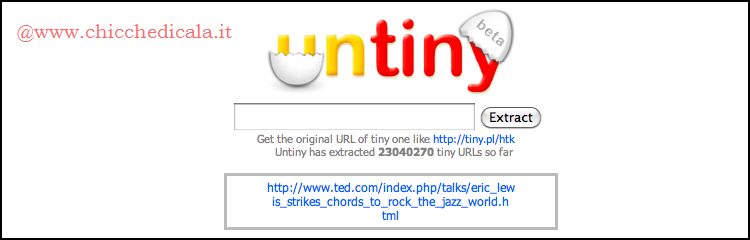 | Untiny è un sito web molto pratico che consente di smascherare uno short URL e vedere in tempo reale il vero link che esso racchiude. In pratica una volta incollato lo short URL sospetto o del quale non si è sicuri e una volta cliccato sul pulsante extract, Untiny provvederà ad estrarre il link nella sua forma completa facendoci visualizzare il vero link di destinazione. | ||