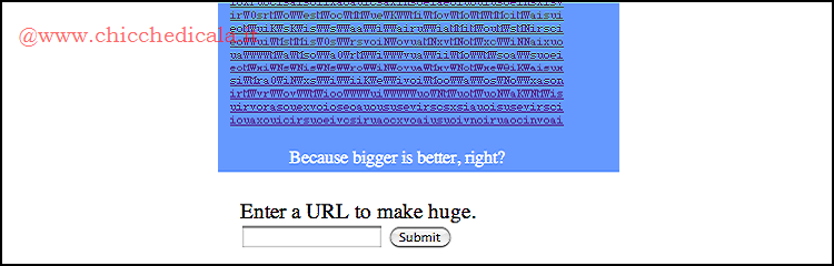 | Un’altra possibilità è che per svariati motivi, vogliate aumentare la lunghezza dell’url (per uno scherzo o per confondere le persone). Ecco quindi giustificata la nascita di HugeURL che ha la funzione esattamente opposta. questo servizio permette di allungare il vostro URL fino a circa 1500 caratteri. |
