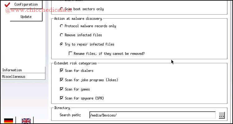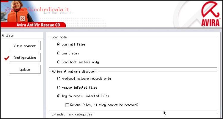 | 3. Verifica re che Scan mode sia posizionata su Scan all files e Action at malware discovery su Try to repair infected files per tentare la riparazione dei file infetti. Extendet risk cotegories infine permette di scegliere quali tipi di elementi devono essere rilevati (selezionare tutto). | ||