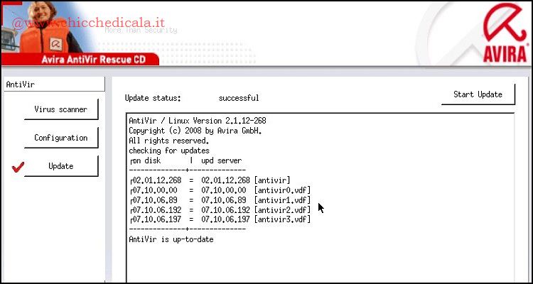 | 4. Se il nostro PC è collegato in Internet attraverso una rete LAN, può tornare utile aggiornare la lista di definizioni dei virus. È sufficiente spostarsi sull’icona Update e cliccare sull’icona Start Update per iniziare a cercare sul server la lista antiVir.vdf più aggiornata. | ||