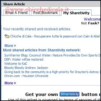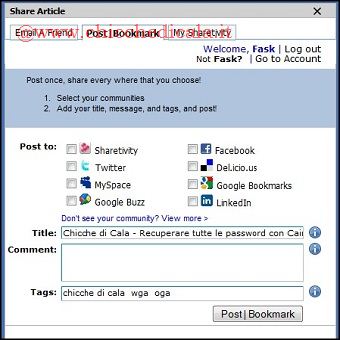 | 3. Ora supponiamo di leggere un articolo e decidiamo di condividerlo con un amico. Basterà cliccare sul widget Share+ per fare apparire una finestra di dialogo contente 3 sezioni suddivise per categoria. Evidenziamo il tab Email A Friend e inviamo il contenuto alla persona desiderata. Una volta che il link viene inviato, sarà automaticamente salvato nella sezione MySharetivity. 4. Se clicchiamo sul tab Post|Bookmark, ci verrà data la possibilità di inviare il contenuto alle varie reti sociali. È possibile selezionare gli 8 servizi che desideriamo visualizzare ogni volta che si utilizza il widget. Cliccando View More potremo scegliere tra 58 siti, tra cui Facebook, Twitter, Delicious, Google Buzz, LinkedIn, Digg, StumbleUpon, FriendFeed, e AIM. | ||