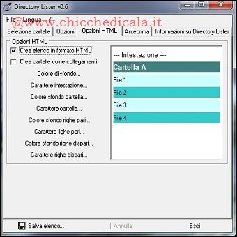 | 3. Spuntiamo la voce Crea elenco in formato HTML, presente nel tab Opzioni HTML, se vogliamo creare una lista in tale formato, visualizzabile con qualsiasi browser. Se abbiamo una raccolta di foto da pubblicare sul nostro sito, questa è la funzione che fa al caso nostro. Vengono inoltre creati dei collegamenti diretti alle varie cartelle, facilitandone cosi l’esplorazione. 4. Dopo avere raccolto tutte le informazioni utili, possiamo osservare i risultati del nostro lavoro nel tab Anteprima. In questo modo, se non siamo soddisfatti, possiamo tornare sui nostri passi e apportare le modifiche necessarie. Al termine, clicchiamo sul pulsante Salva elenco per selezionare la cartella nella quale verrà salvata la lista dei file. | ||