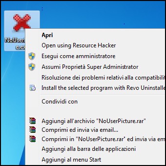 | 1. Scarichiamo l’archvio NoUserPictures.zip e estraiamo il contenuto sul desktop. Posizioniamo NoUserPictures.exe nella cartella Esecuzione Automatica, in modo che agisca in Background ad ogni accesso. Per farlo apriamo il menu Start/Tutti i Programmi, clic destro sulla Cartella Esecuzione Automatica e selezioniamo Apri. 2. Lanciamo come amministratore il file e rispondiamo OK nella finestra successiva. | ||