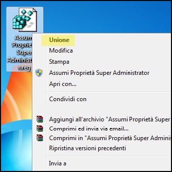 | 1. Come prima cosa dovremo assumere le proprietà di Explorer.exe. Per farlo scarichiamo questo archivio e, con un doppio clic uniamo la chiave Assumi Proprietà Super Administrator.reg al registro di configurazione di Windows. Nel caso abbiate il UAC abilitato confermate l’azione rispondendo SI e nelle due finestre successive cliccate nuovamente SI/OK. 2. Ora portiamoci in C:\Windows, clicchiamo con il tasto destro del mouse su explorer.exe e selezioniamo la voce Assumi Proprietà Super Administrator per avere il pieno controllo ed effettuare le modifiche necessarie senza dover seguire nessuna regola o permesso./td> | ||