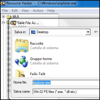 | 3. Modifichiamo Explorer.exe | 4. Salviamo con nome | |