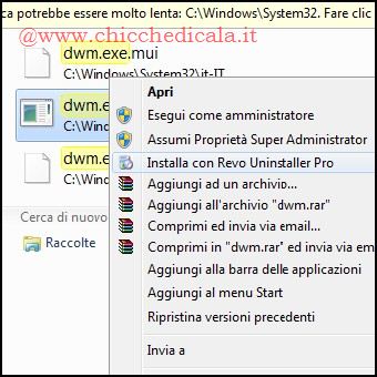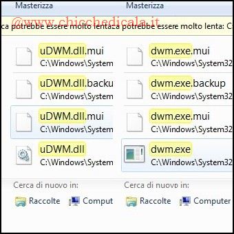 | 3. Apriamo il menu Start e nella casella di ricerca digitiamo Servizi seguito da Invio. Individuiamo “Gestione Sessioni di Gestione finestre Desktop” e Arrestiamo il servizio cliccando col tasto destro del mouse e selezionando la voce analoga. 4. Apriamo l’esplora risorse di Windows e portiamoci in C:\Windows\System32. Nella casella di ricerca digitiamo dwm.exe e assumiamo le Proprietà come Super Administrator. Stesso procedimento dovrà essere effettuato anche per la libreria uDWM.dll. | ||