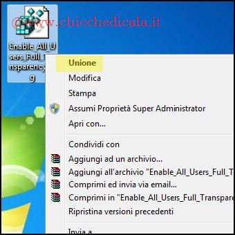 | 5. Successivamente effettuiamo un backup per entrambi i file rinominandoli semplicemente in “.Backup” e incolliamo i file dwm.exe, uDWM.dll patchati. 6. L’ultimo passo consiste in alcune modifiche al registro di sistema. Scarichiamo l’archivio Enable_All_Users_Full_Transparency.zip e scompattiamo il contenuto sul Desktop. Con un doppio clic uniamo la chiave al registro di configurazione. Nel caso abbiate il UAC abilitato confermate l’azione rispondendo SI e nelle due finestre successive cliccate nuovamente SI/OK. | ||