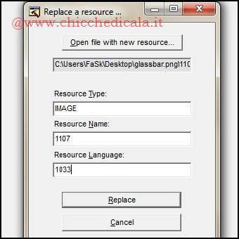| 5. All’interno dell’archivio scaricato al passo 1 troveremo una cartella contente due immagini .png che andranno sostituite a quelle originali, quindi espandiamo la cartella IMAGE individuiamo le cartelle 1107, 845, evidenziamo la voce 1033 e con un clic destro selezioniamo Replace Resource… 6. Clicchiamo sul pulsante “Open File With New Resouces…” e carichiamo l’immagine “1107.png”. Ora ricompiliamo aero.msstyles digitando IMAGE nel campo Resources Type, 1107 nel campo Resource Name, 1033 nel campo Resource Language e clicchiamo Replace. Stessa procedura andrà effettuata per l’immagine 845.png. | ||