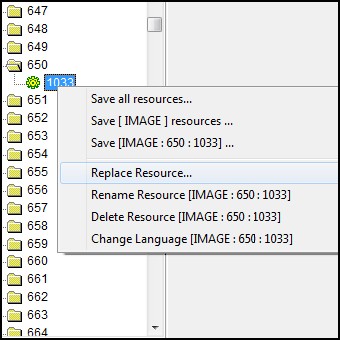 | 5. Per ricompilare il file con le immagini personalizzate apriamo aero.msstyles con Resource Hacker individuiamo le cartelle indicate al passo 5, evidenziamo la voce 1033, clicchiamo col tasto destro e selezioniamo Replace Resource. 6. Clicchiamo sul pulsante “Open File With New Resouces”, carichiamo l’ immagine corrispondente digitiamo IMAGE nel campoResources Type, 650 nel campo Resource Name, 1033 nel campo Resource Language e clicchiamo Replace. Stessa procedura andrà effettuata per tutte le altre immagini cambiando il campo Resouce Name col numero corrispondente. | ||